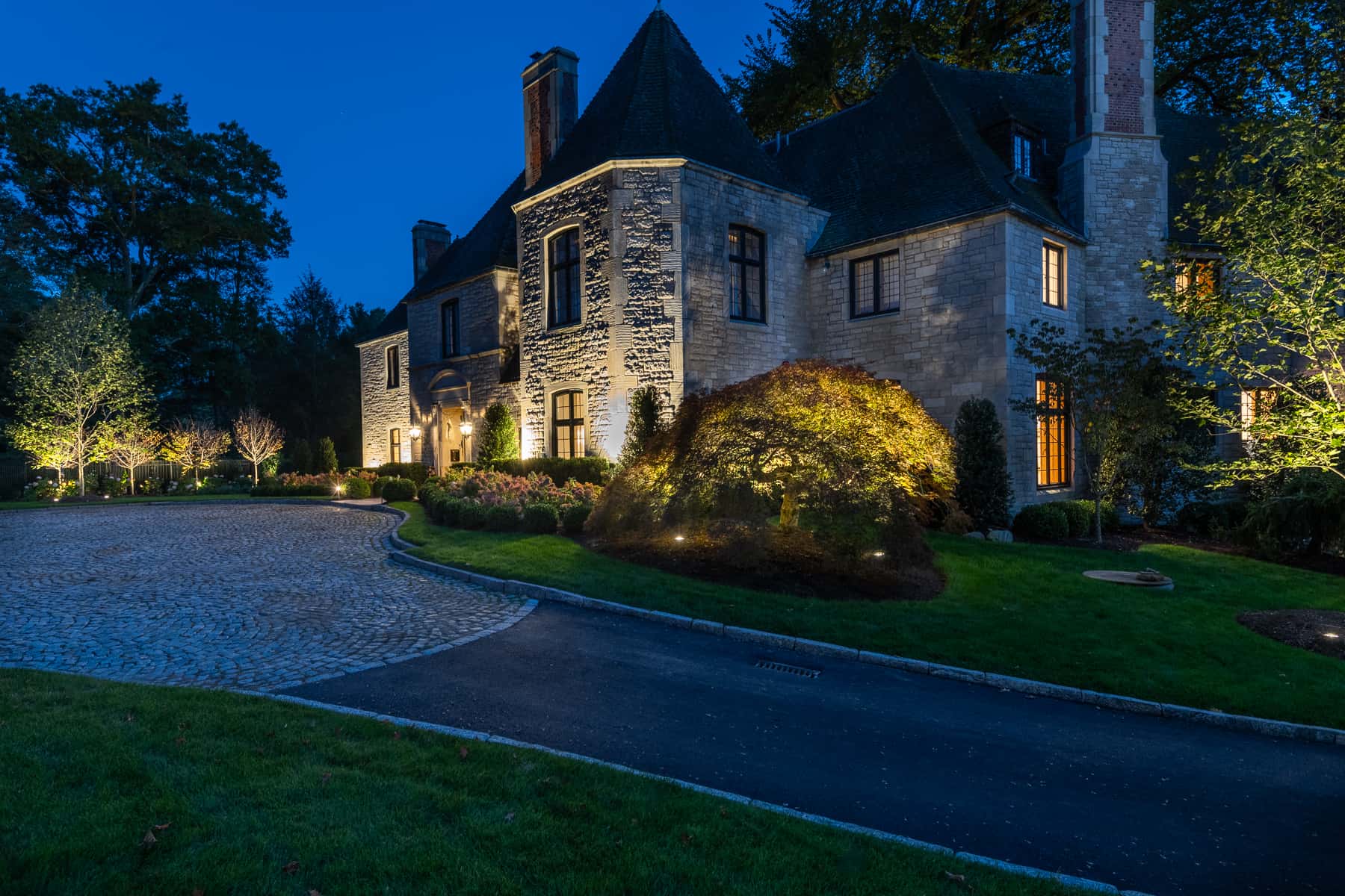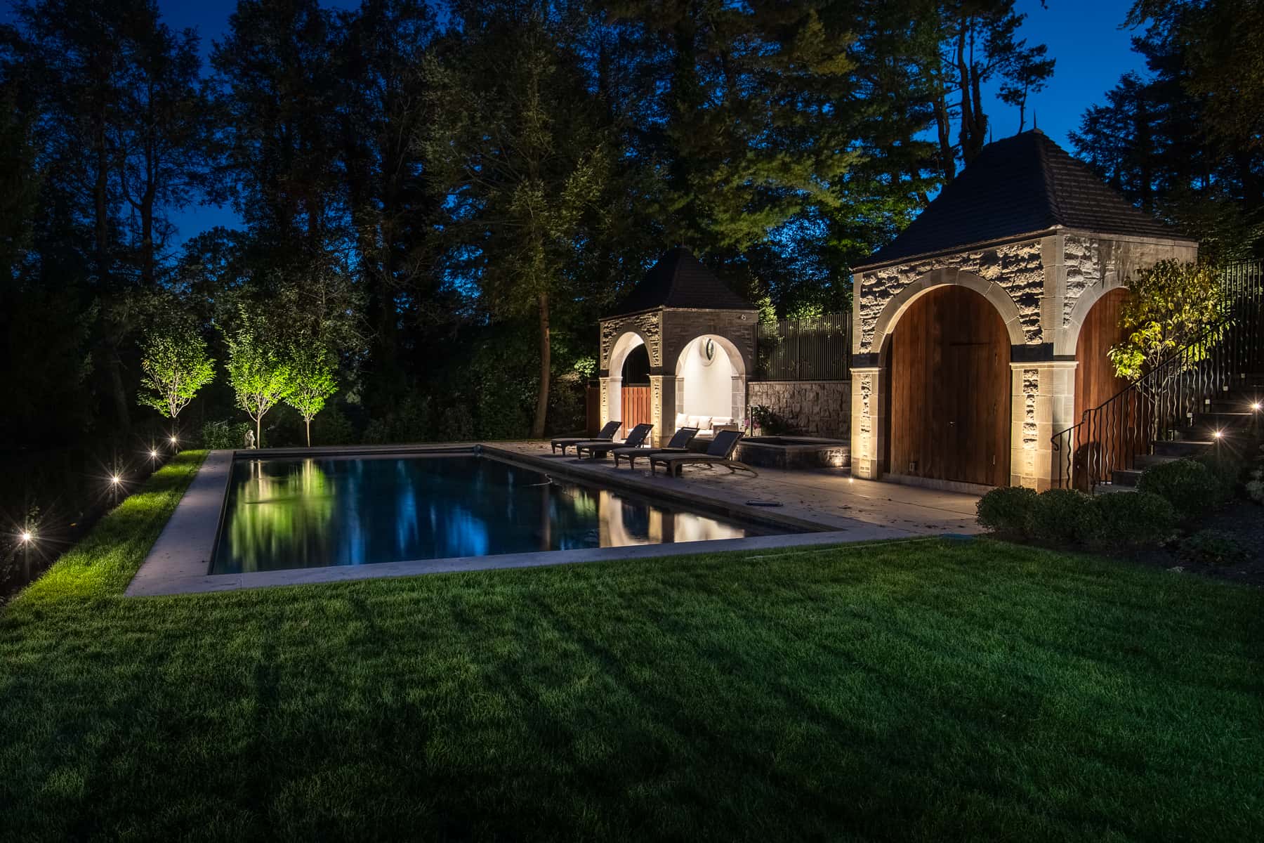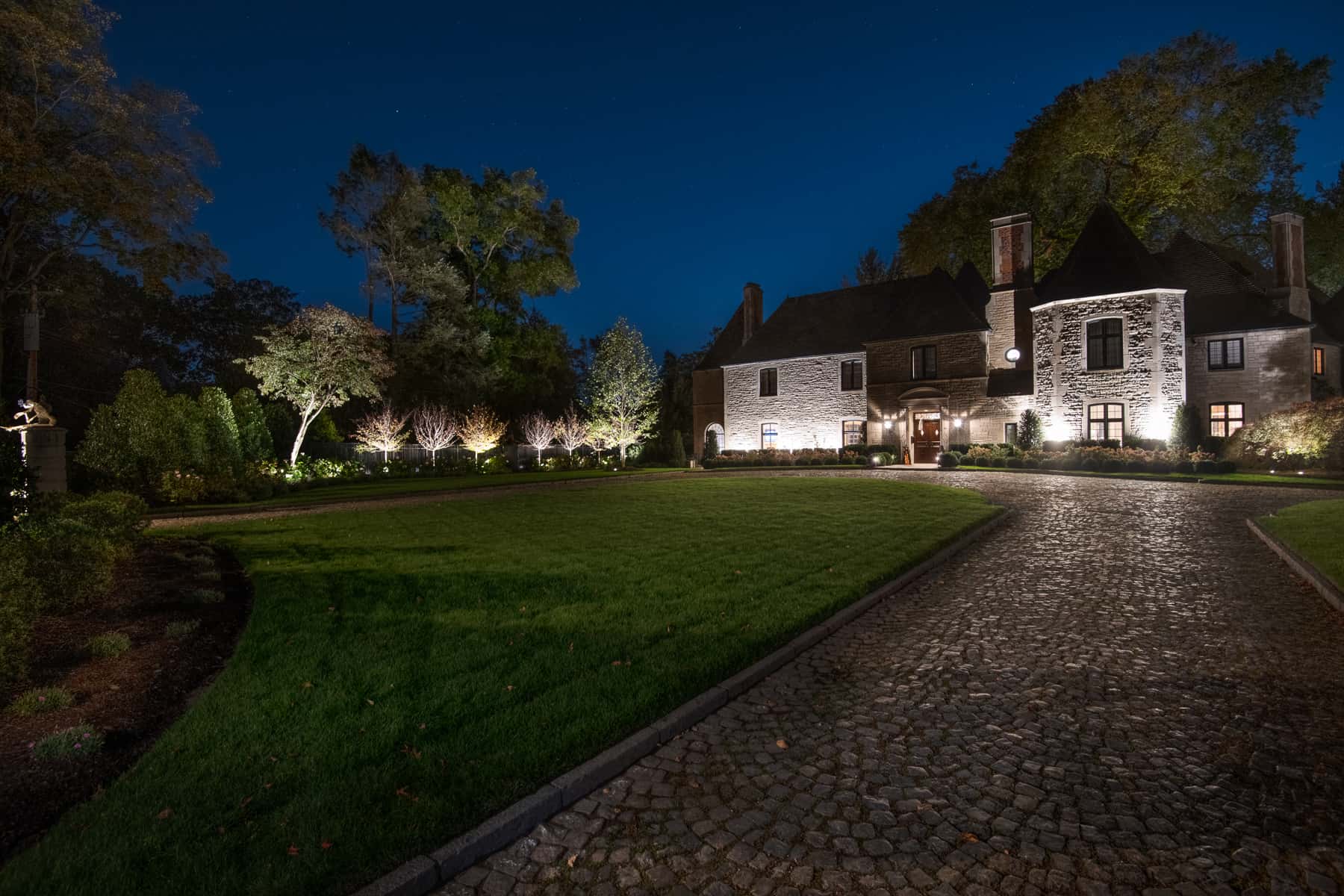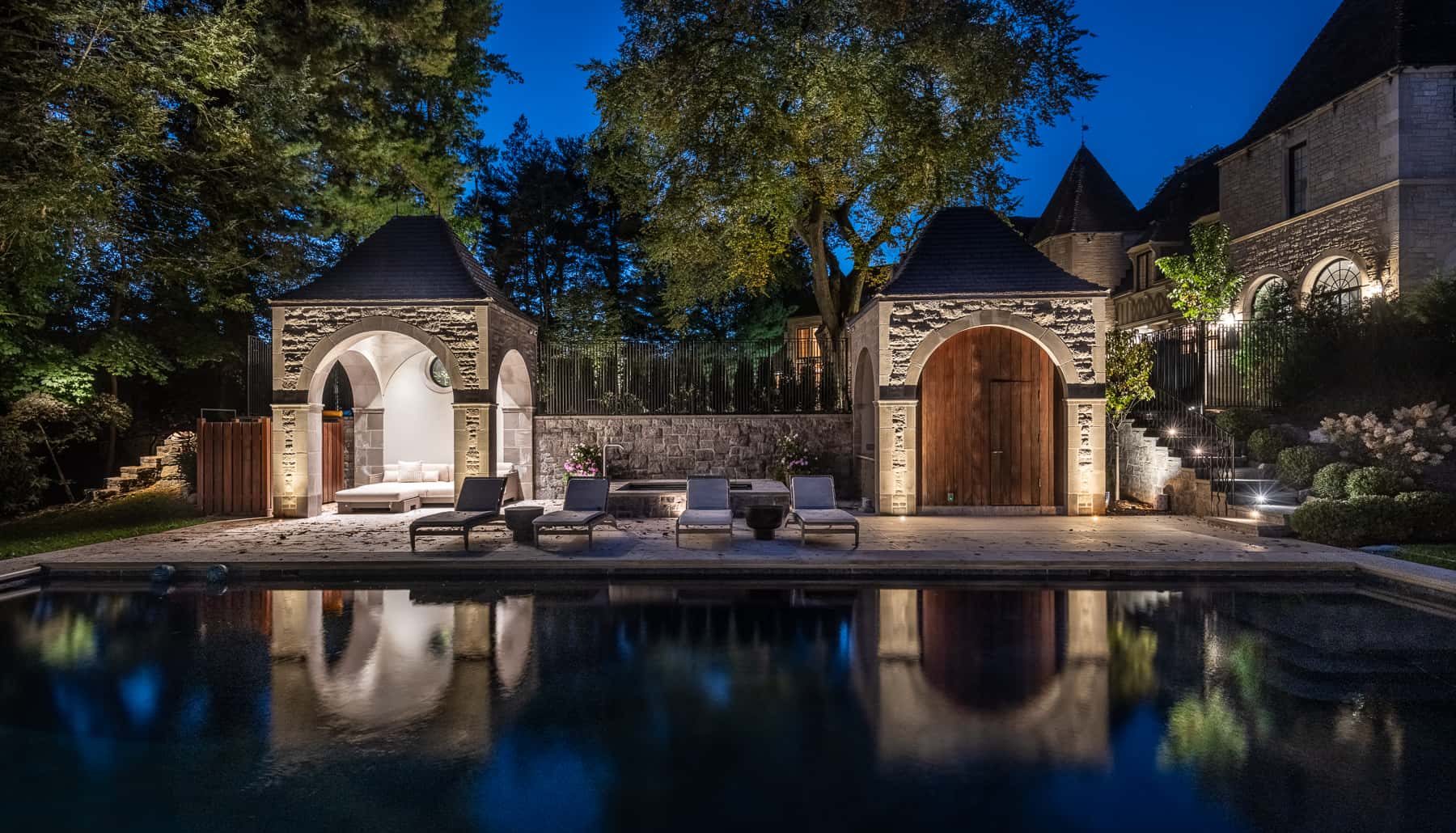 To enhance the elegance of the estate, specific focal points were intentionally emphasized. This approach included uplighting the stone façade, ornamental trees, shrubs, pathways, gardens, pool, pool house, stone steps, and rear patio. Throughout the design, it was critical to maintain continuity of light, ensuring a seamless transition from one element to the next. The result is a balanced and refined landscape lighting composition that feels unified, intentional, and timeless.