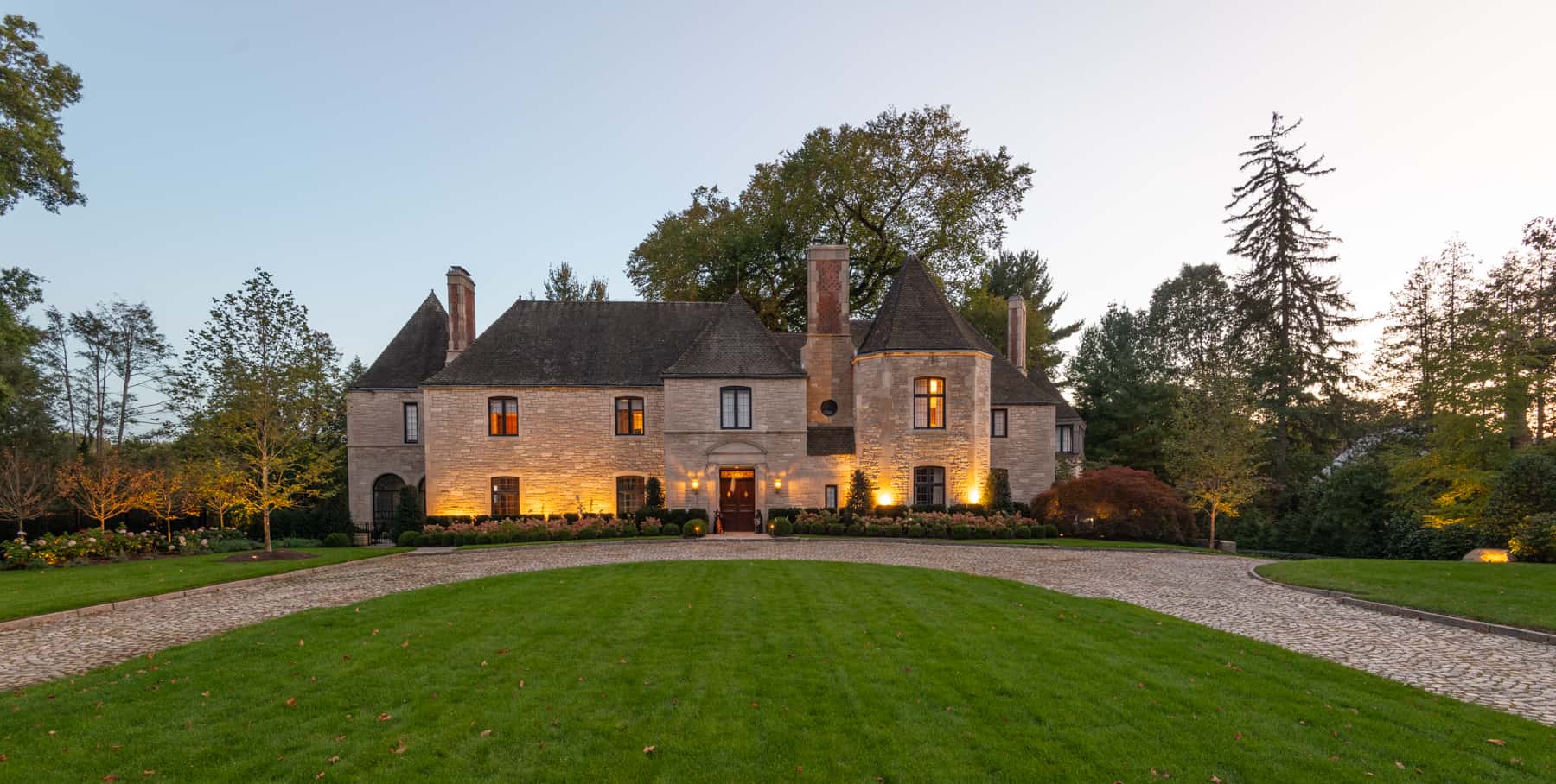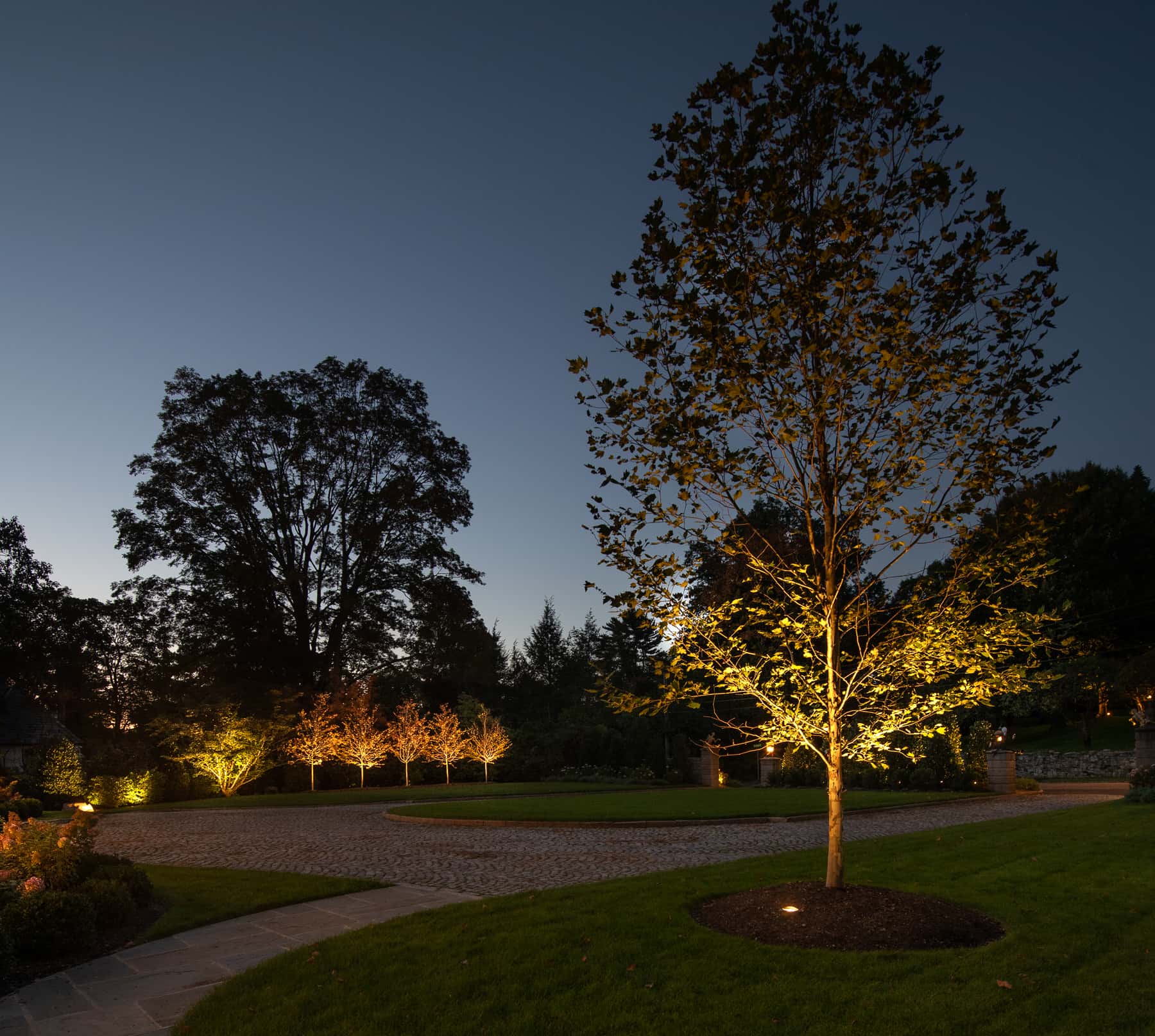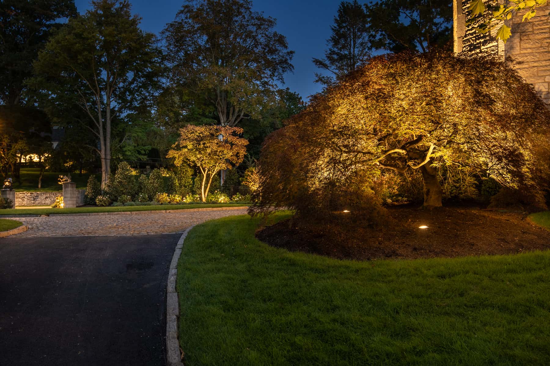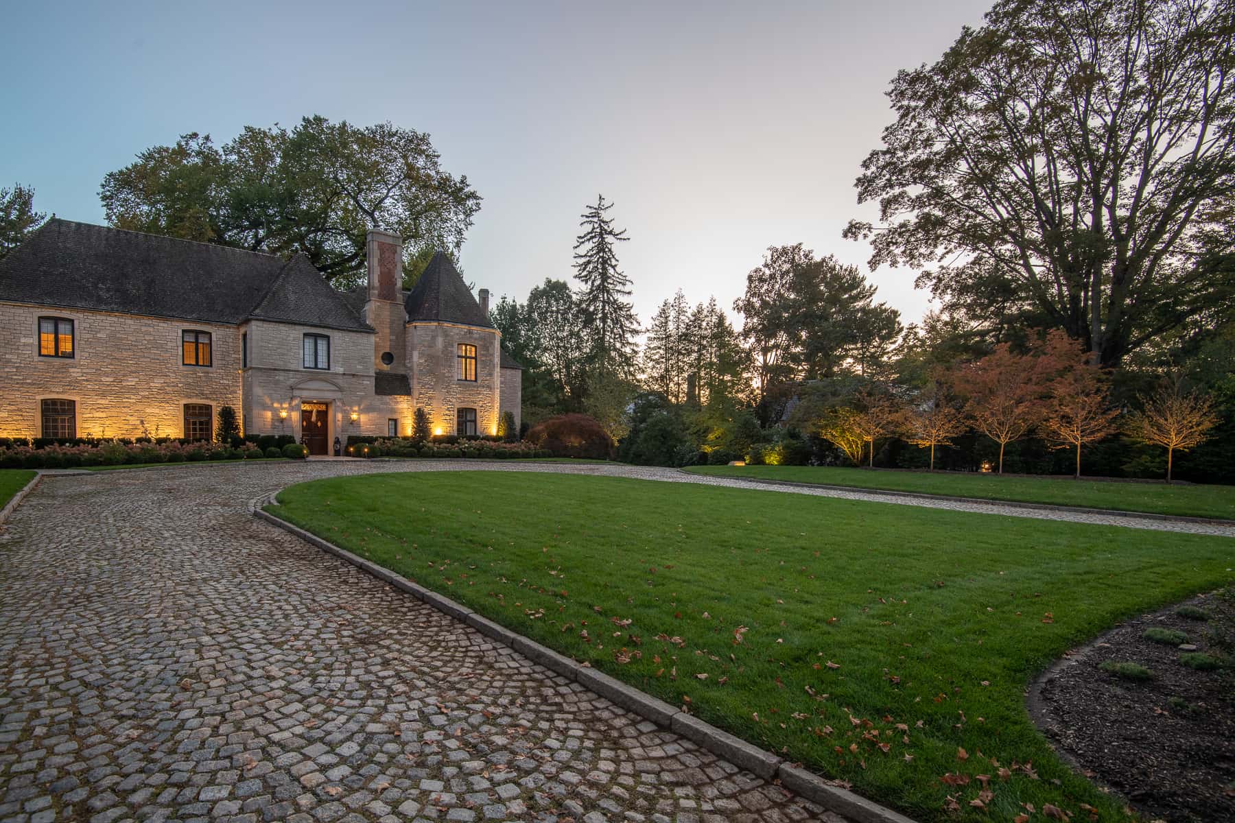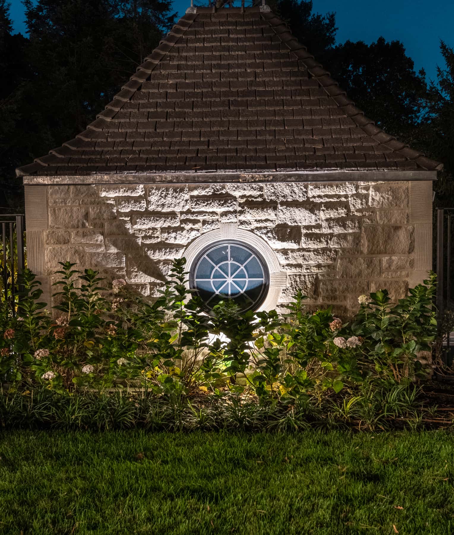 To enhance the elegance of the estate, specific focal points were intentionally emphasized. This approach included uplighting the stone façade, ornamental trees, shrubs, pathways, gardens, pool, pool house, stone steps, and rear patio. Throughout the design, it was critical to maintain continuity of light, ensuring a seamless transition from one element to the next. The result is a balanced and refined landscape lighting composition that feels unified, intentional, and timeless.