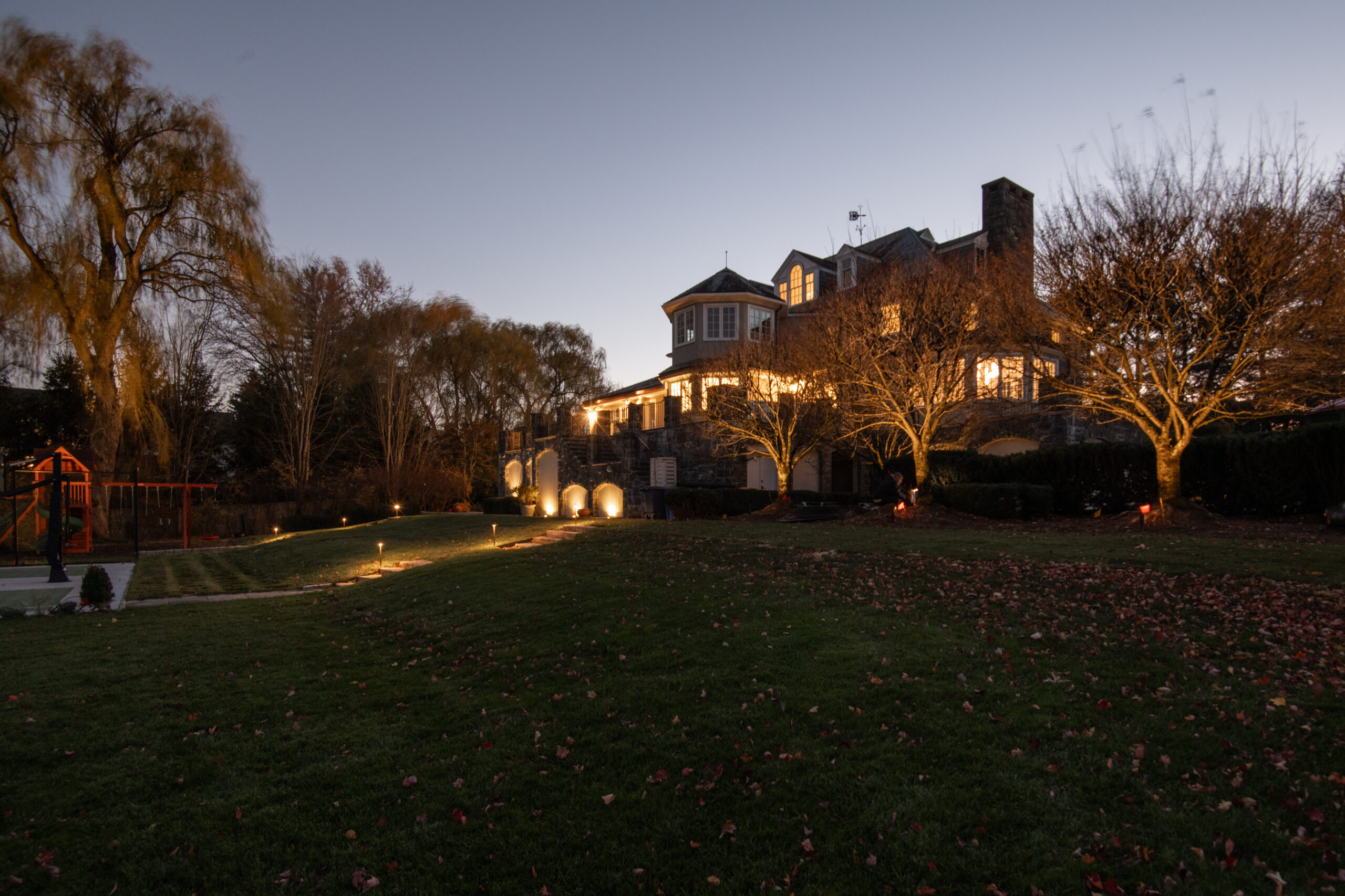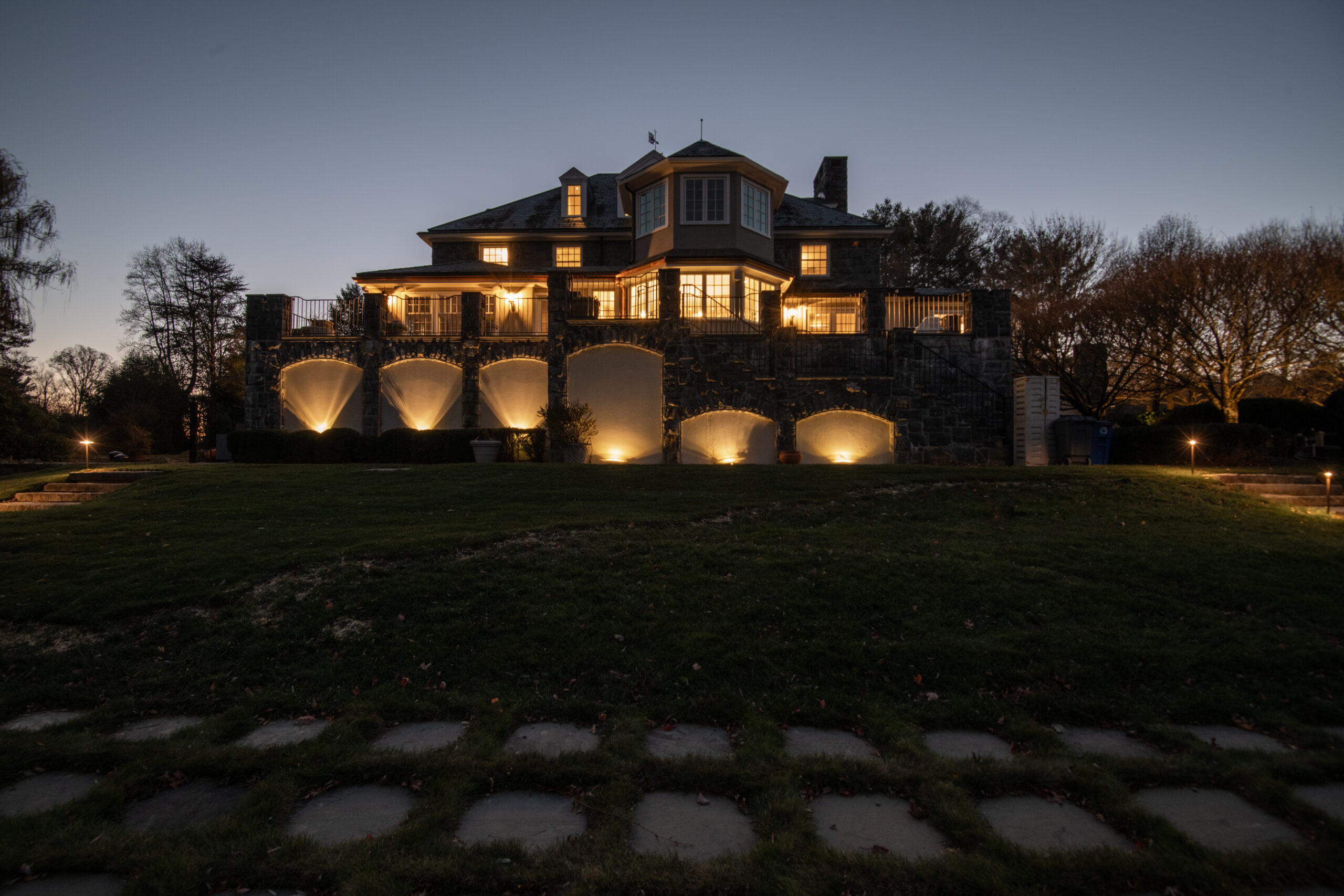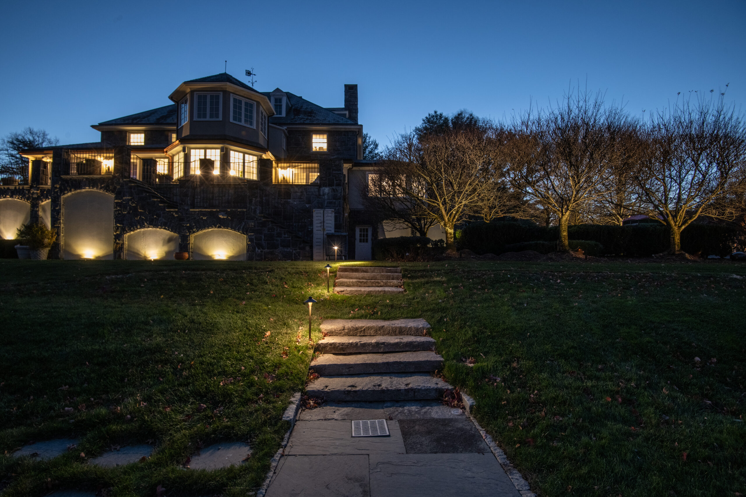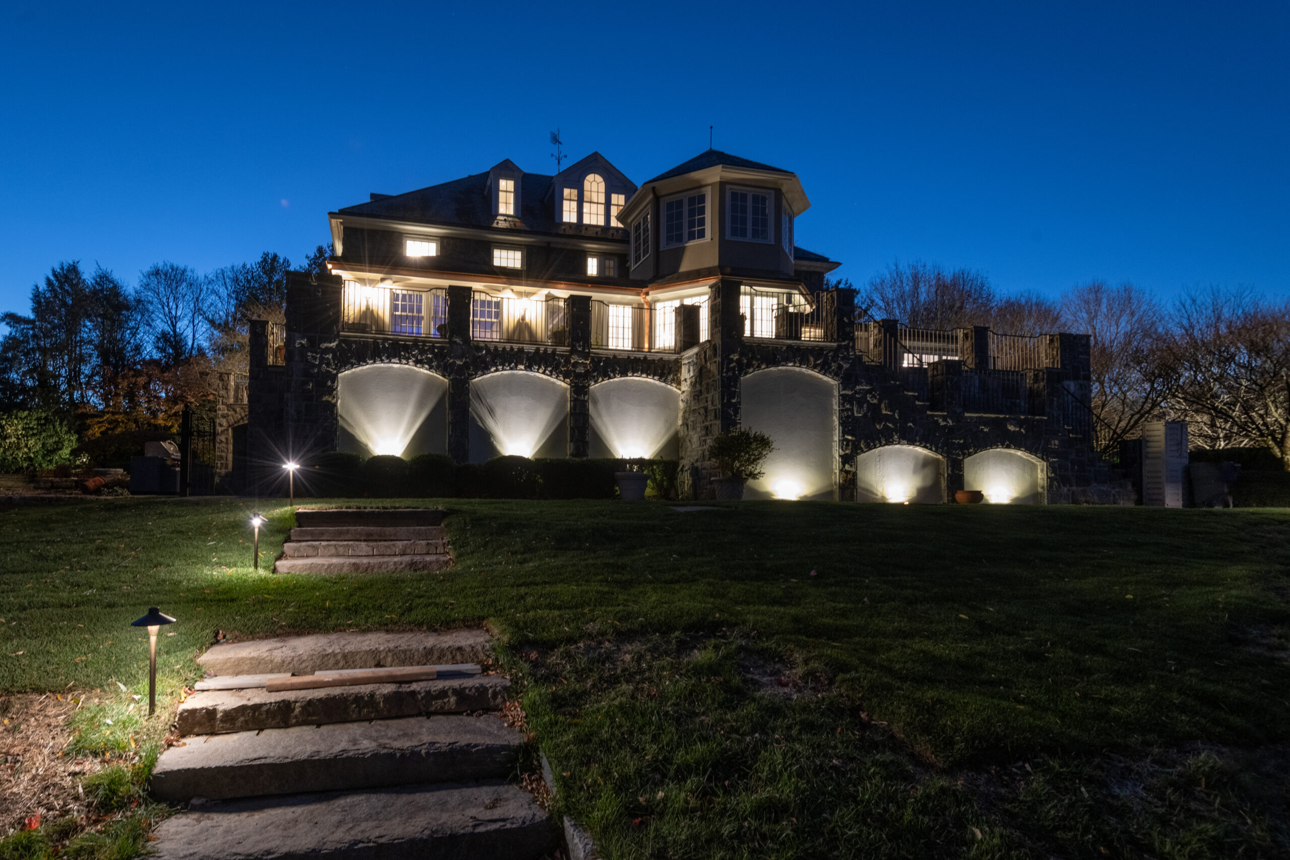 This grazing technique also highlights the underside of architectural elements, including the bay window frames, adding depth and dimension to the façade. Façade lighting requires careful planning to avoid glare caused by light reflecting off or penetrating windows. The overall placement of fixtures was designed to create visual cohesion—bringing together the stone architecture and the surrounding plant material into a unified nighttime composition.