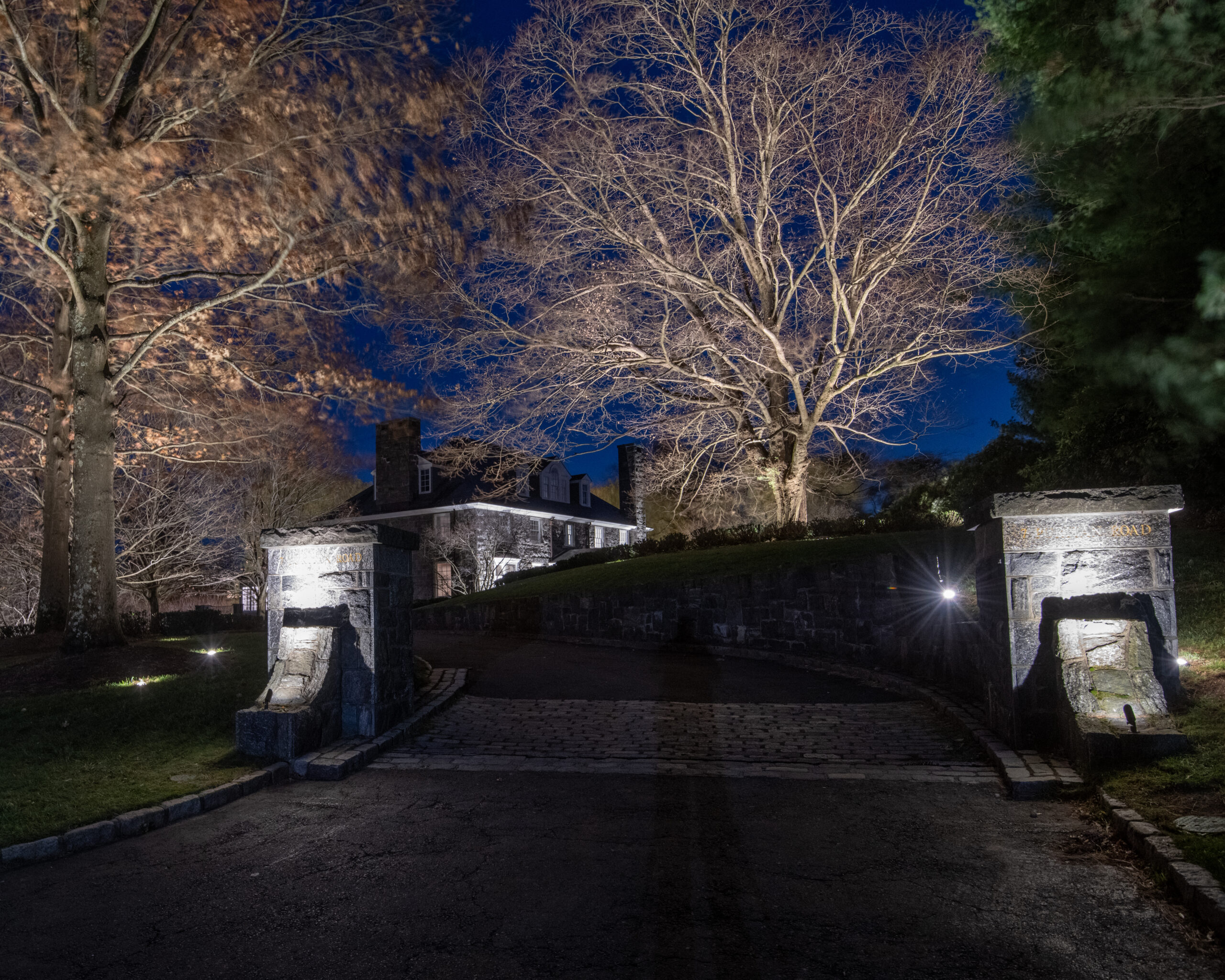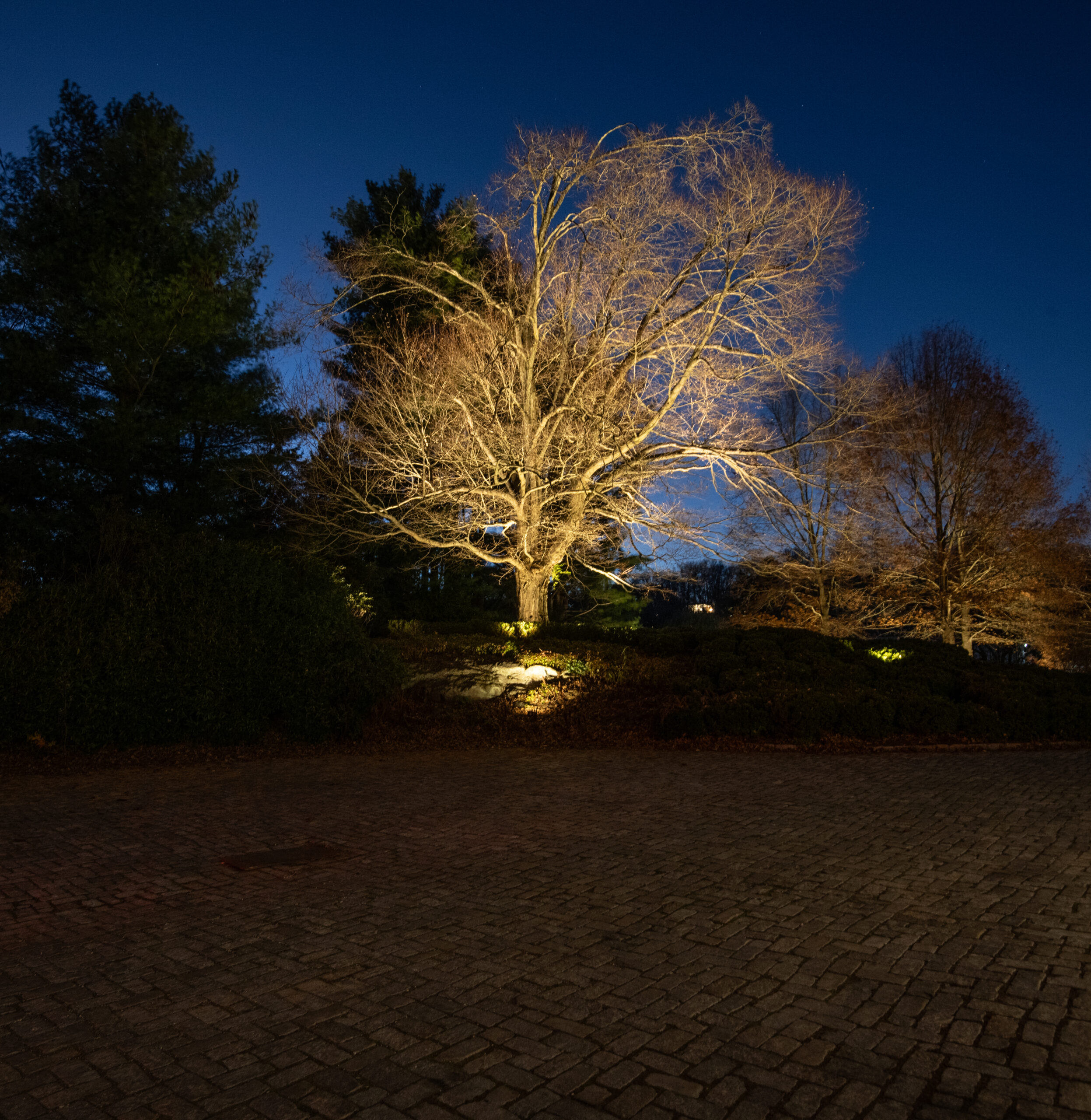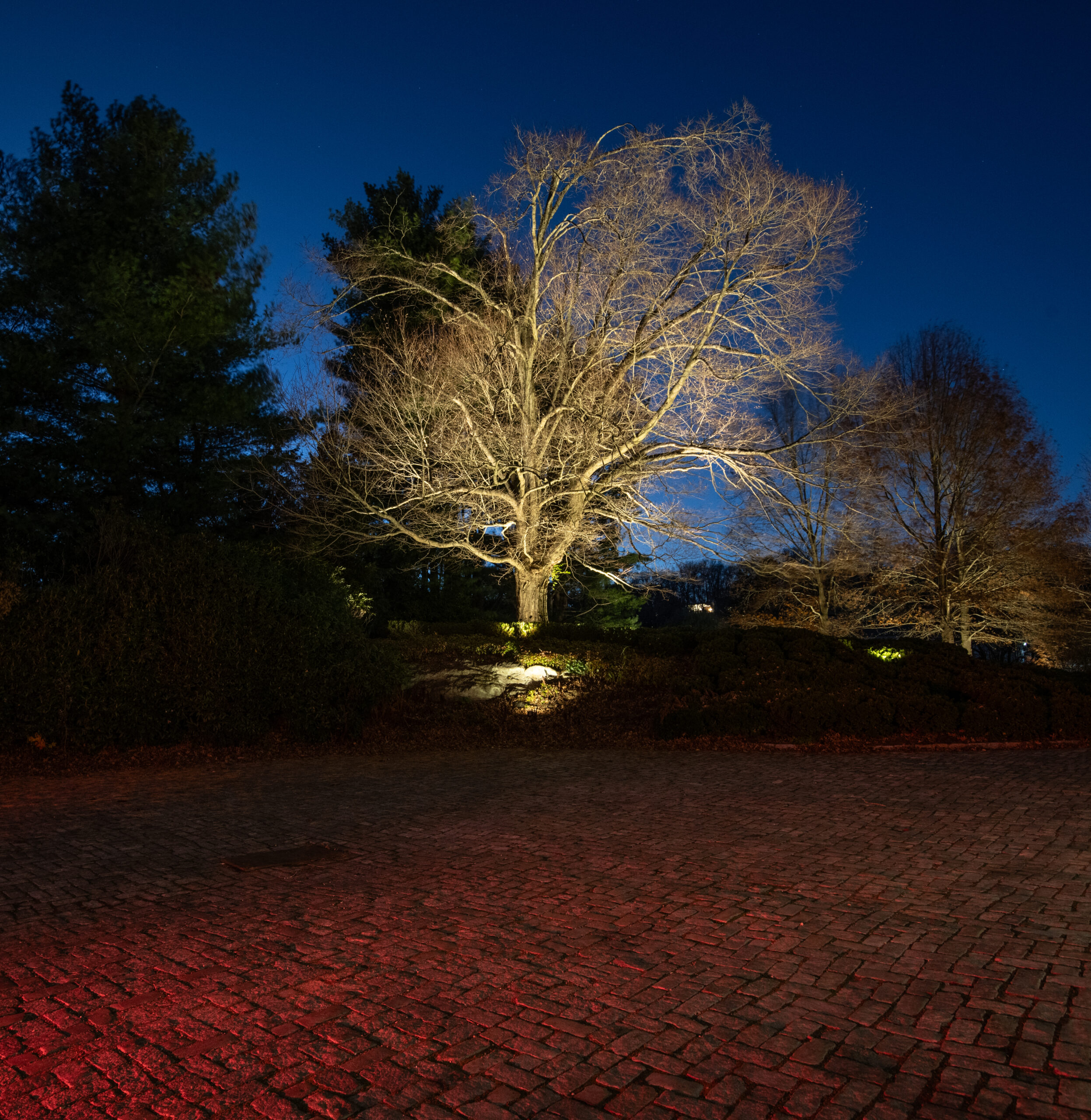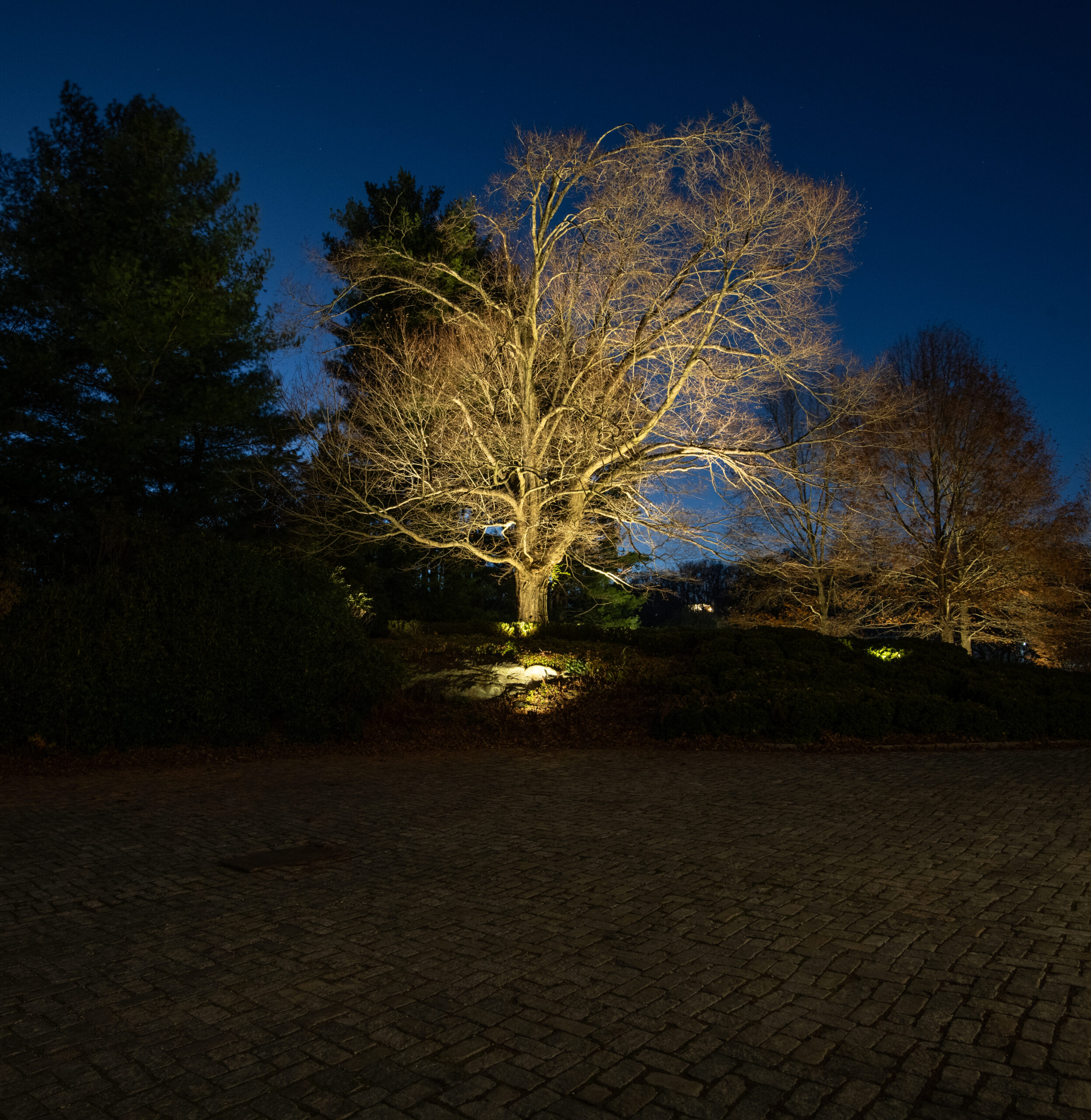 This effect was achieved by installing multiple fixtures beginning at the trunk and extending outward beneath the branches. The light filters through the structure of the tree before finishing by illuminating the full canopy. Each layer of light was carefully considered to preserve the tree’s natural form while enhancing its scale. Because this tree serves as a primary focal point on the property, it was intentionally illuminated at a higher level than its surrounding elements.
