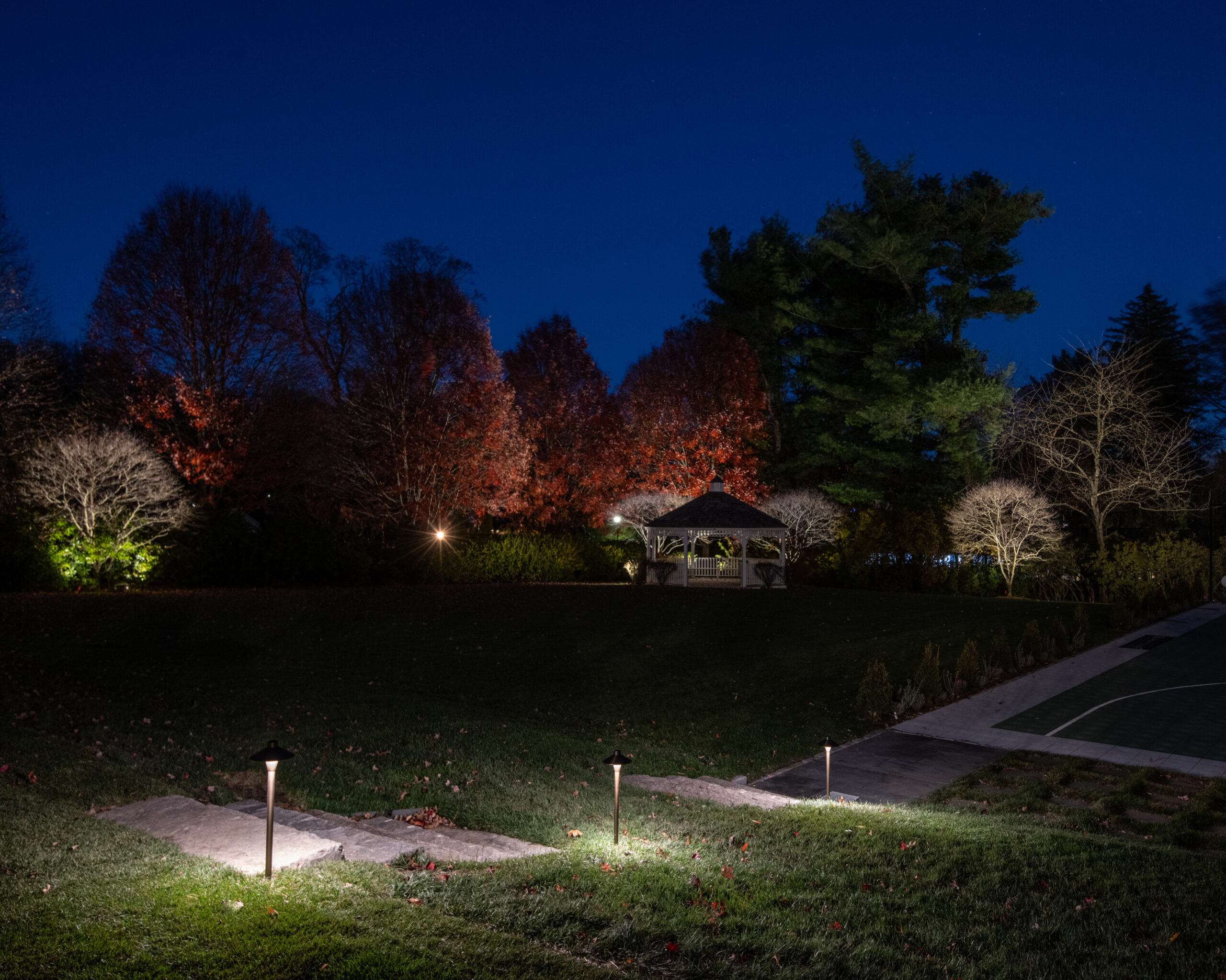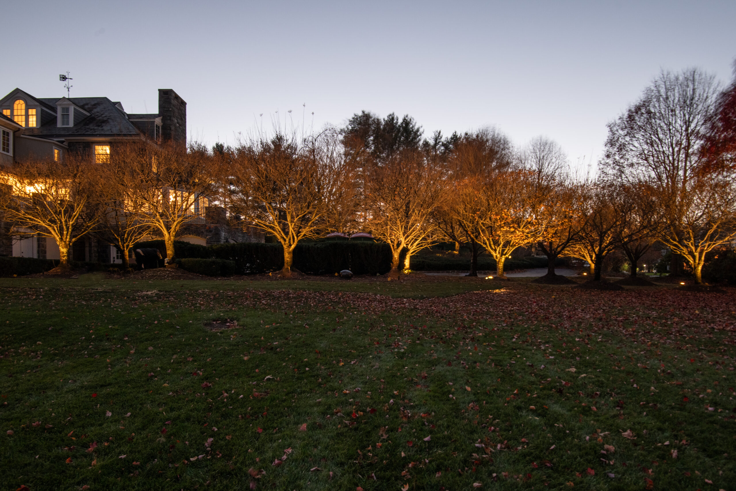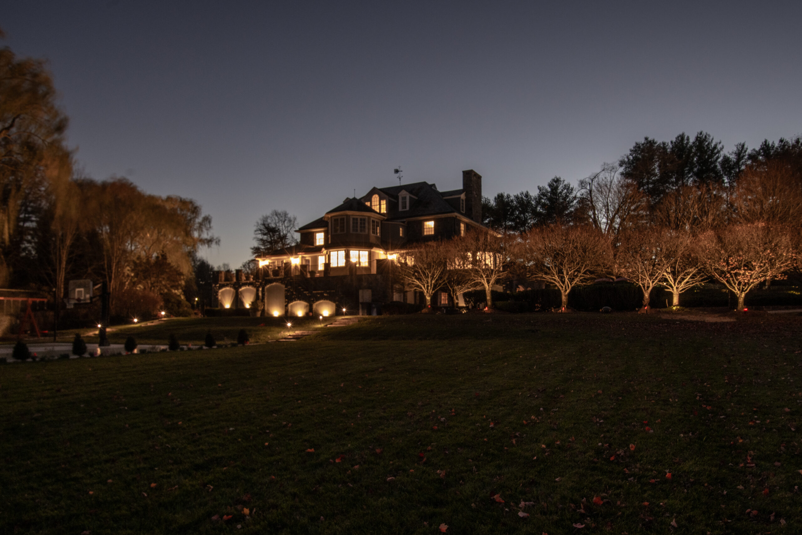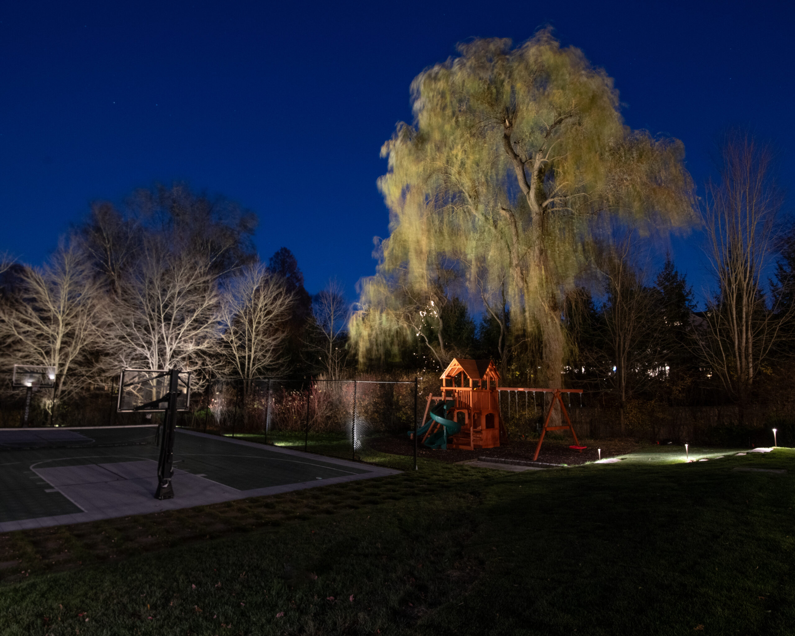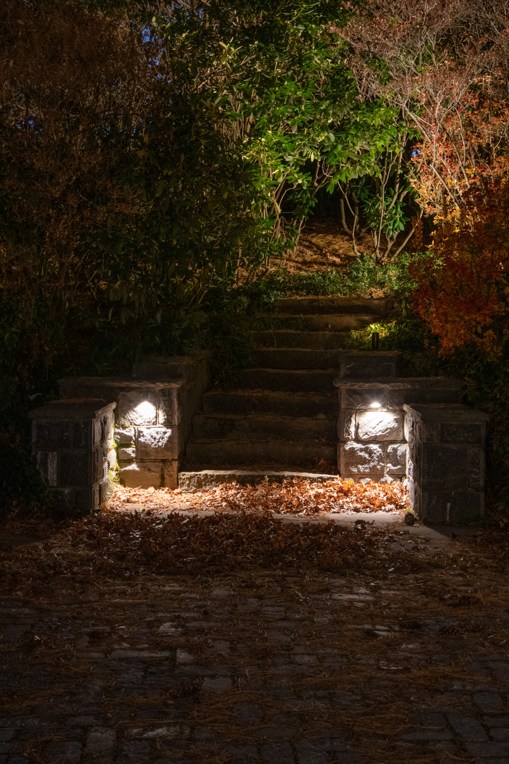 This effect was achieved by installing multiple fixtures beginning at the trunk and extending outward beneath the branches. The light filters through the structure of the tree before finishing by illuminating the full canopy. Each layer of light was carefully considered to preserve the tree’s natural form while enhancing its scale. Because this tree serves as a primary focal point on the property, it was intentionally illuminated at a higher level than its surrounding elements.