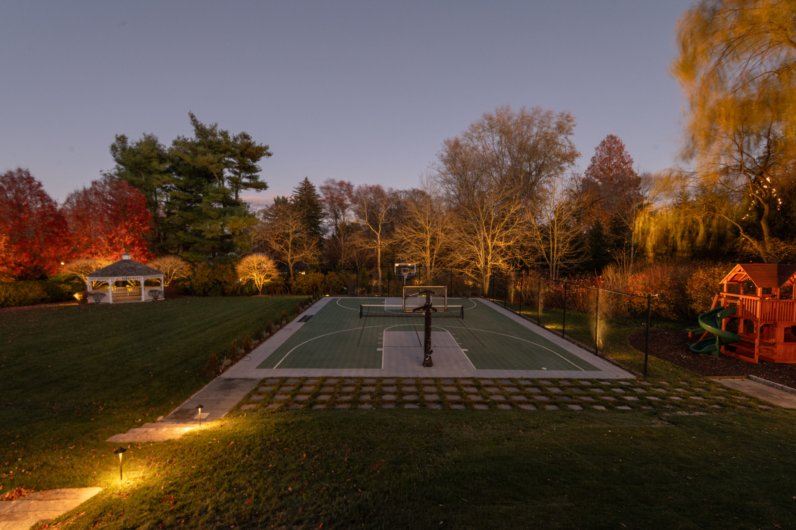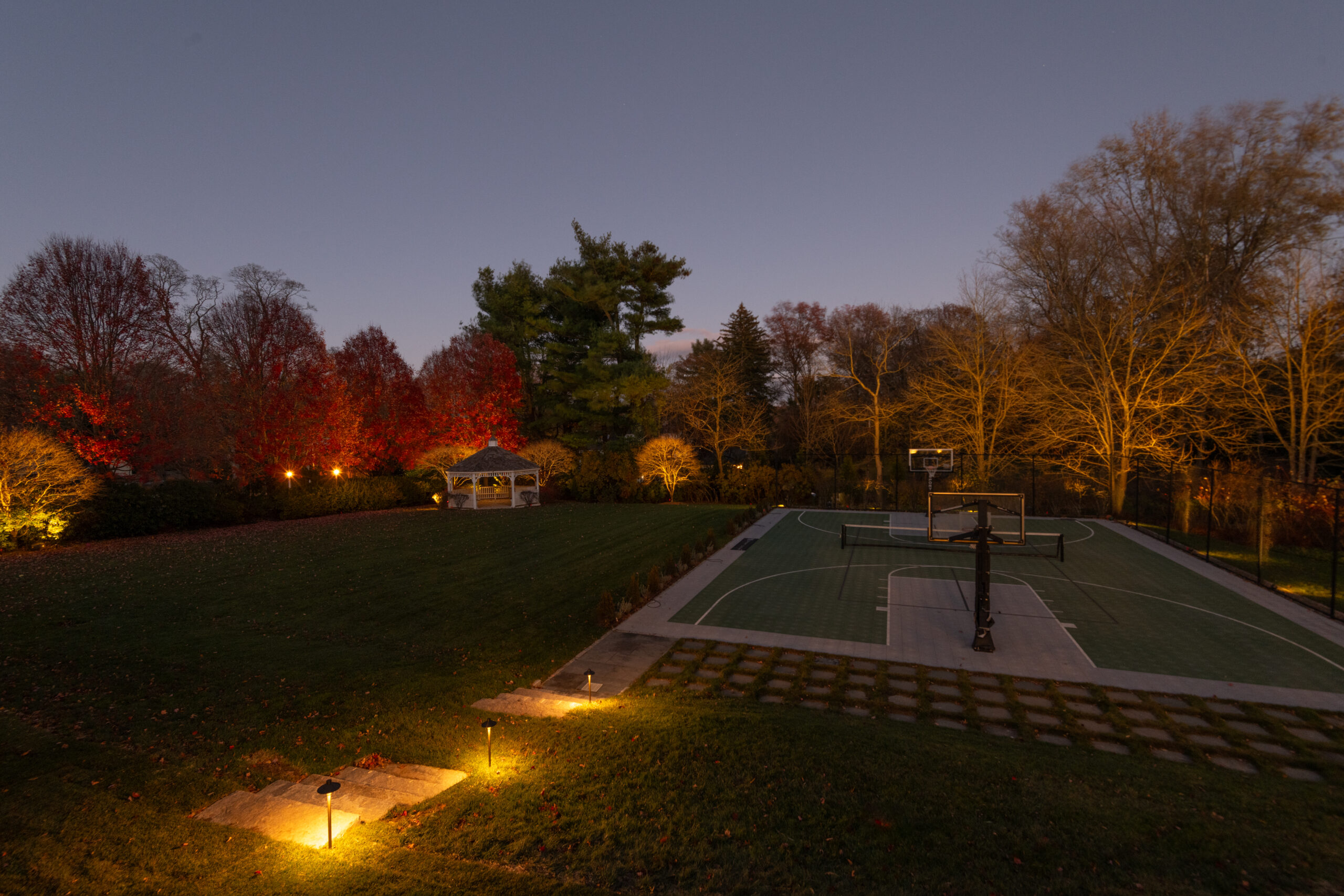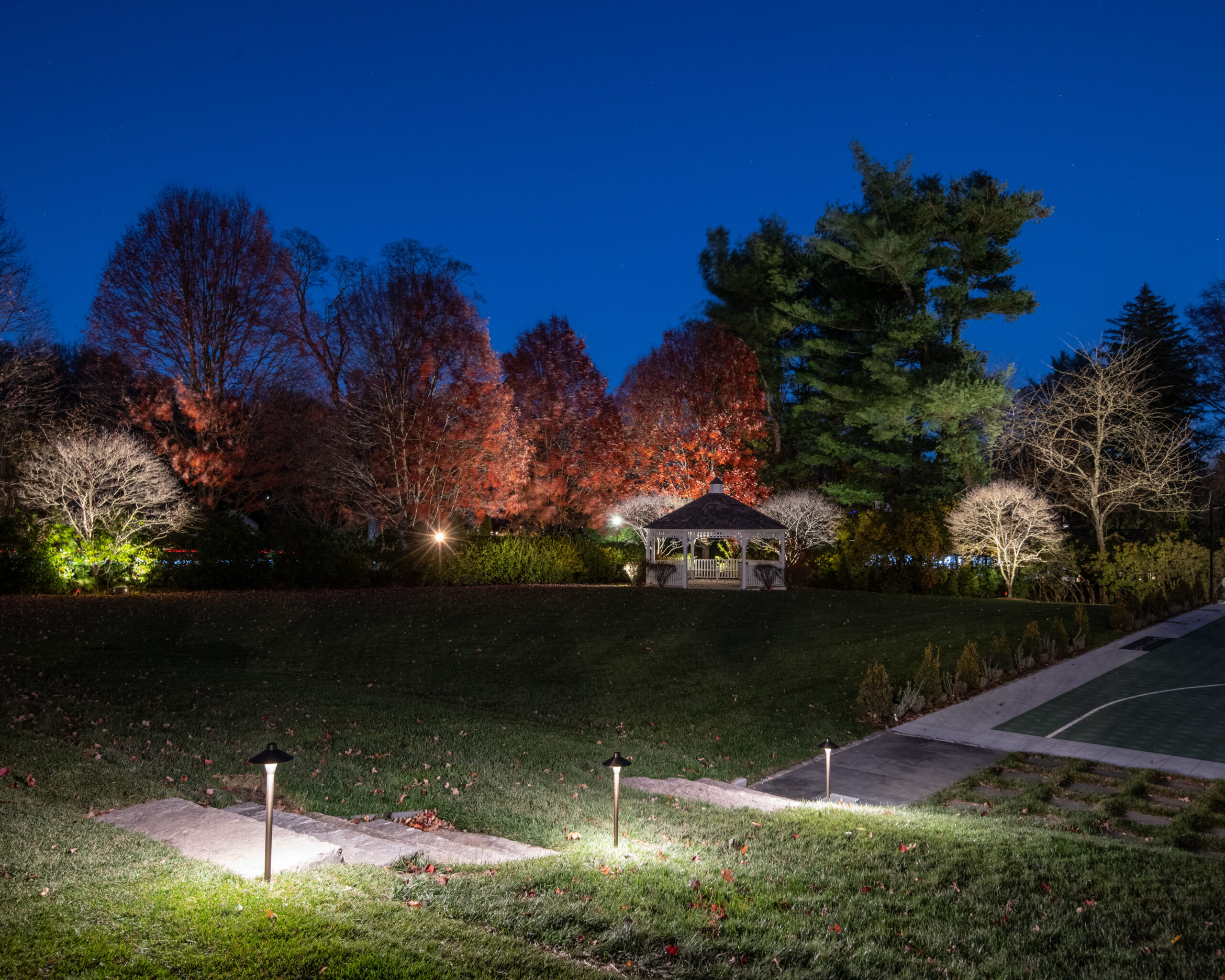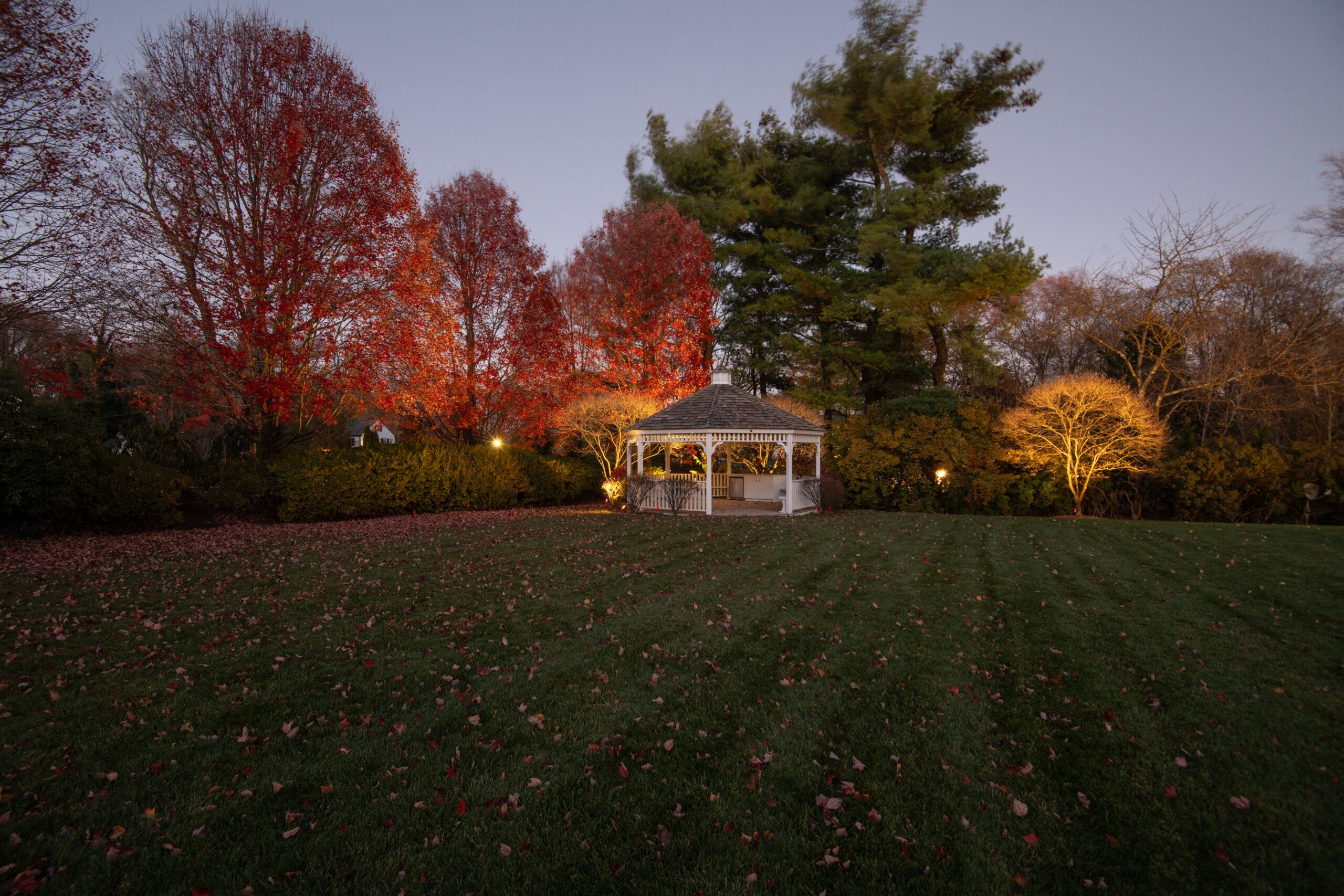 This effect was achieved by installing multiple fixtures beginning at the trunk and extending outward beneath the branches. The light filters through the structure of the tree before finishing by illuminating the full canopy. Each layer of light was carefully considered to preserve the tree’s natural form while enhancing its scale. Because this tree serves as a primary focal point on the property, it was intentionally illuminated at a higher level than its surrounding elements.